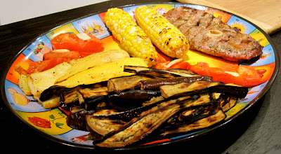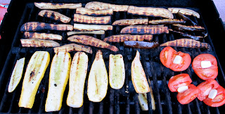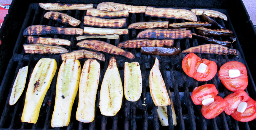 I heated the grill to medium-high and grilled the eggplant, squash, and tomatoes, keeping an eye on the clock and removing vegetables to a platter and covering them with foil as they finished cooking.