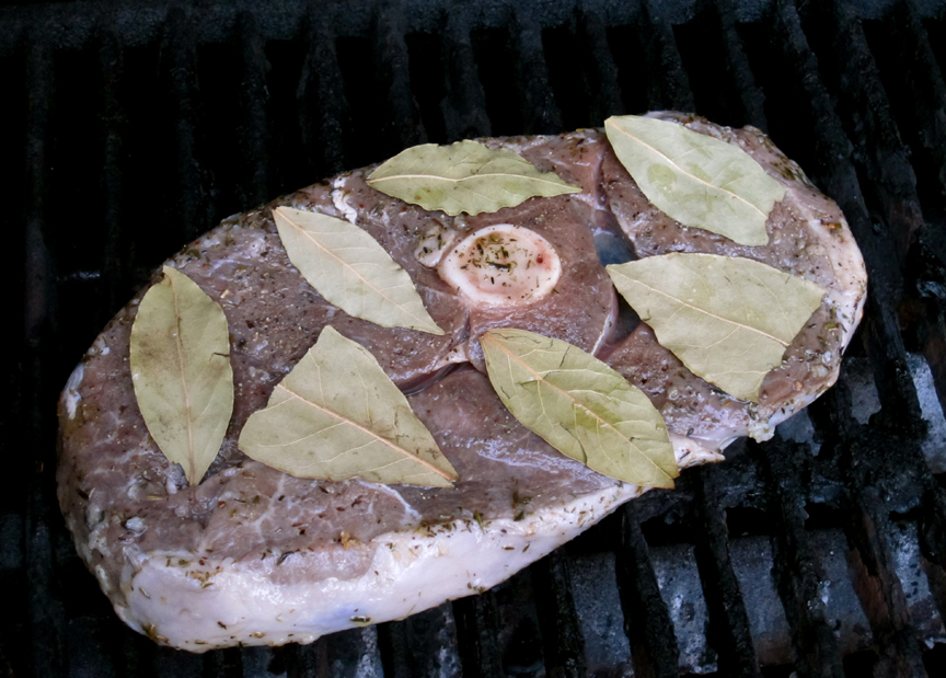 Here’s the steak with the bay leaves on top, ready for the grill to work its magic: