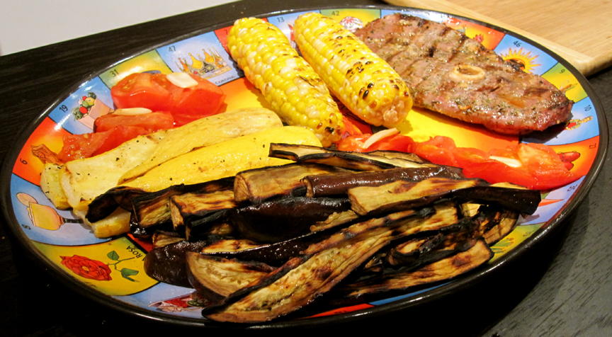 Eggplant, yellow squash, and tomatoes, halfway through the grilling process (Much to Dave’s chagrin, those are neither pats of butter nor slabs of cheese on the tomatoes; they’re garlic cloves.):