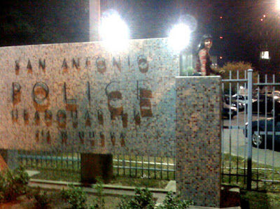 Last night, after Tex-Mex and a kickass pomegranate margarita (!), I climbed up the base of a light post and used a fence as a sideways ladder so I could scramble on top of the San Antonio Police Headquarters sign. My mom was on the phone with my dad at the time, and I heard her say something like, “Oh… not much. We just had dinner and now Melissa is probably going to get arrested.”