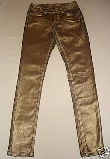 Aren’t those the tackiest, Vegas-y, most wonderful skinny jeans EVER?! They’re Deréon, which is so embarrassing and cheesy, it’s fantastic. I have an odd fascination with Beyoncé — or should I say Sasha Fierce — right now. The bodysuits! The taut+lush ponytail! The über-serious expression. I love how Beyoncé has, like ZERO sense of humor about herself. I mean, don’t you get the sense that she refers to herself in the third person? It’s so freakin’ awesome. So, yeah. I bought her gold jeans. In a tiny size, too.