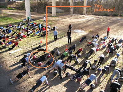 Back to 2009. In the foreground, another CrossFitter named Melissa. She and I tied for third place in the Spartan Challenge last summer. She’s a badass. I’m pretty sure she’s conquered kipping pullups by now. And there I am, push-up-ing. No Coach Megan in site, but look at that plank. Pretty sweet!