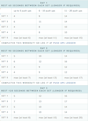 Woot! Just finished day three of column two. The first round of 10 was rough, and the 8 wasn’t much more fun. Something magical happened on the second round of 7… I got some kind of momentum going or something, and they felt GREAT! Easy. Chest touched every time. But it was short-lived: the last ‘max’ round was tough. I squeezed out 12, but the last two were slooooooooooooow.