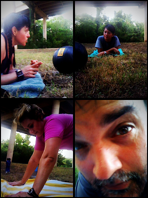 Overhead tap situps with the medicine ball, then throw it to the person on your left. Total reps per person: 60; with the ball: 20.Plank for 1:30