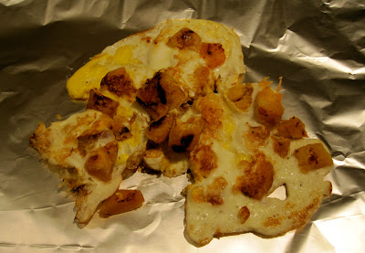 Finally, I microwaved the sweet potatoes, cut them into cubes, threw them in a searingly hot pan so they’d get some nice brown marks on them, sprinkled them with garlic powder and salt, then added the egg whites and spread it out like a pancake. SUCCESS! The whole thing got a nice dry texture and lovely brown carmelization on both sides.
