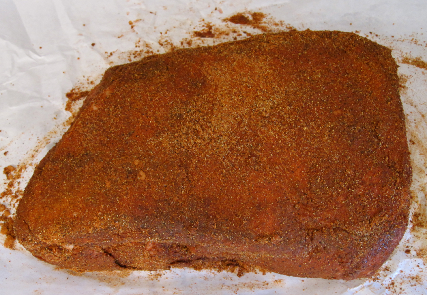 Season the butt. (Heh, I said ‘butt.’) Mix all the spices together and massage the blend all over the pork; be sure to get it into all the nooks and crannies. Amuse yourself by saying, “Wanna pat the butt?” or I’m massaging the butt!” or “This butt massaging sure feels good!” When you’re finished, it will look something like this.